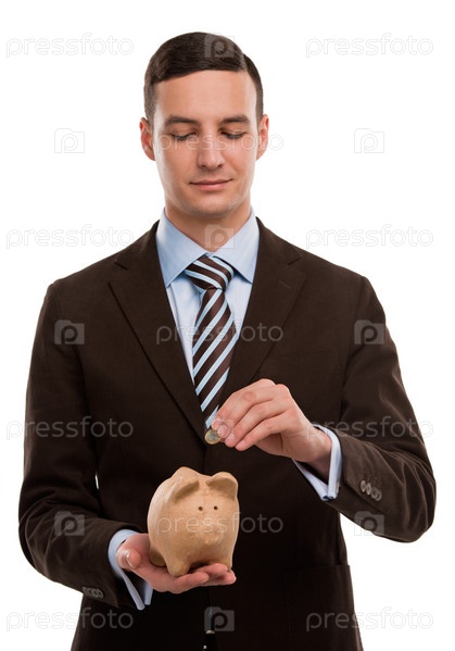 Молодой счастливый деловой человек кладет деньги в копилку на белом фоне