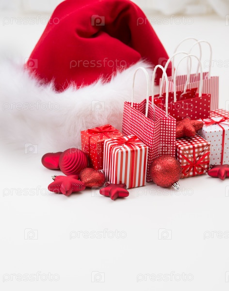 Красные рождественские подарки и украшения на белом фоне