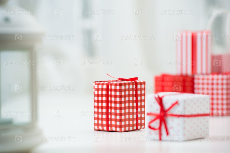 Красные рождественские подарки и украшения на белом фоне
