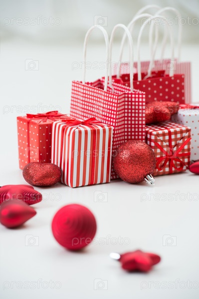 Красные рождественские подарки и украшения на белом фоне