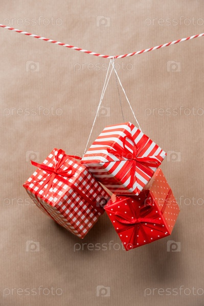 Красные подарочные коробки висят на ленте. Старый фон из коричневой бумаги