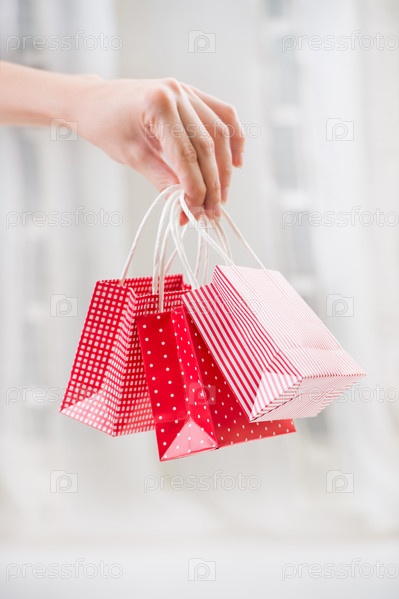 Женская рука держит красные подарочные пакеты
