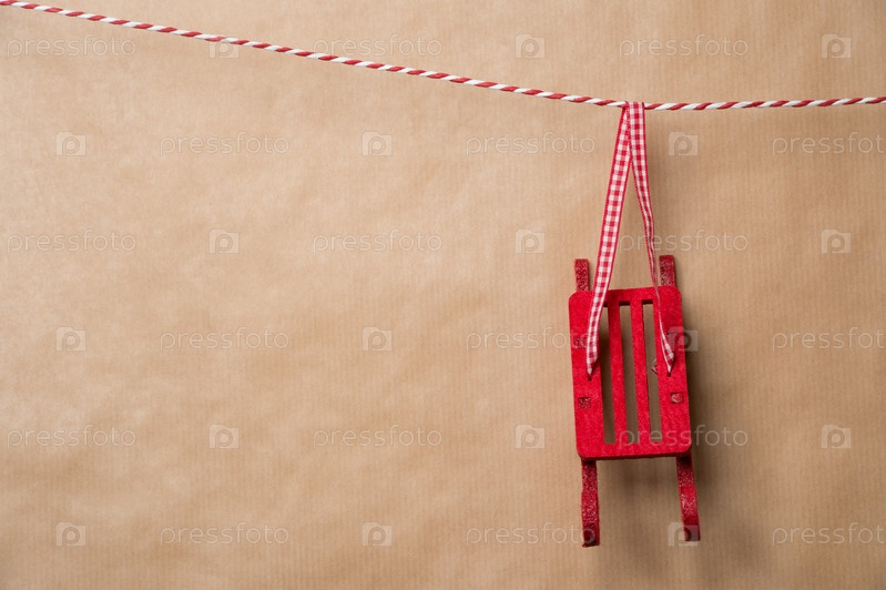 Новогодняя игрушка в виде санок висит на ленте на фоне старой коричневой бумаги