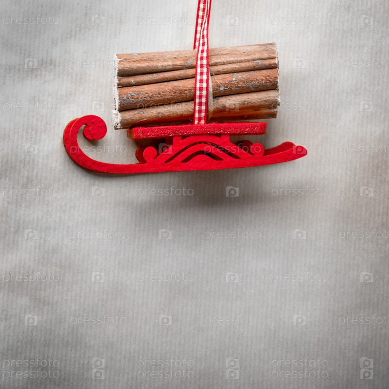 Новогодняя игрушка в виде санок висит на ленте на фоне старой коричневой бумаги