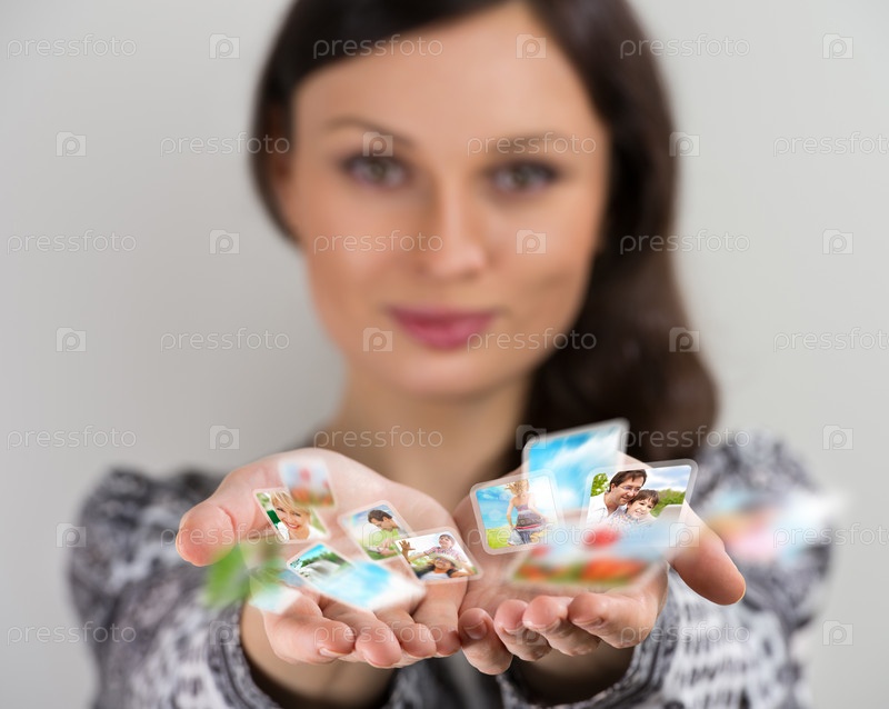 Хорошенькая молодая брюнетка с руками, сложенными вместе, загрузка фото и видео файлов в социальные сети. Виртуальный интерфейс будущего