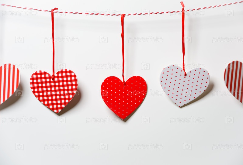 Красные текстурированные сердца висят на белом фоне