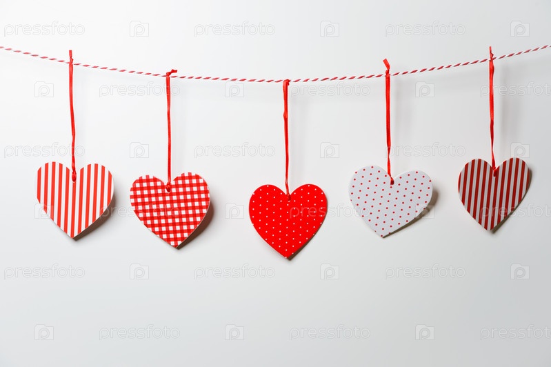 Красные текстурированные сердца висят на белом фоне