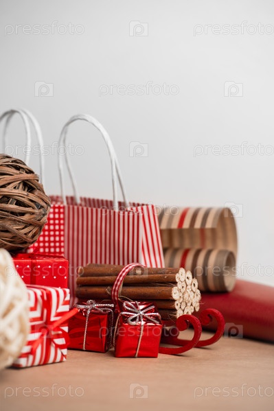 Рождественский фон с красными подарочными коробками, пакетиками и украшениями