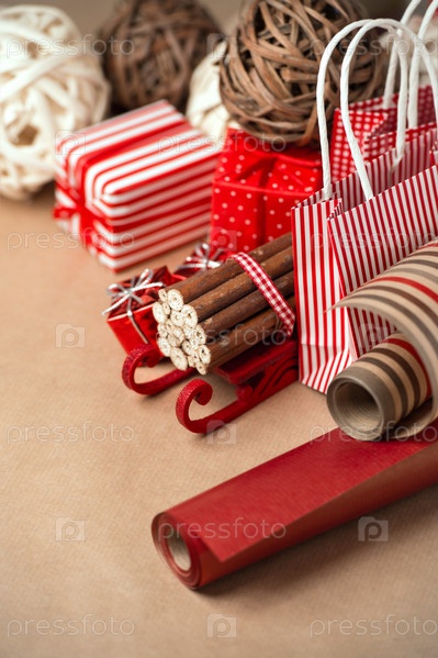 Рождественский фон с красными подарочными коробками, пакетиками и украшениями