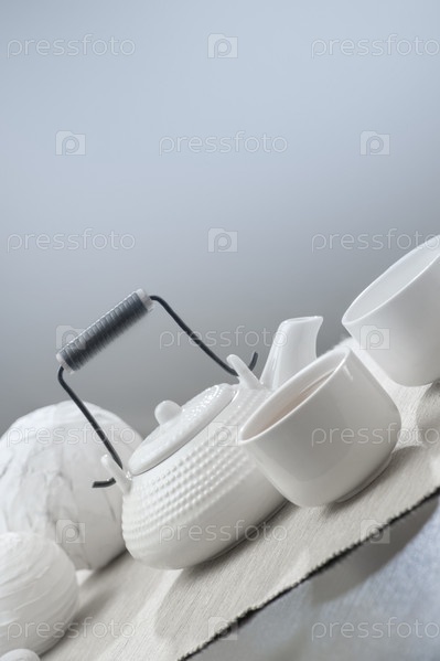 Заварочный чайник и чашки на столе