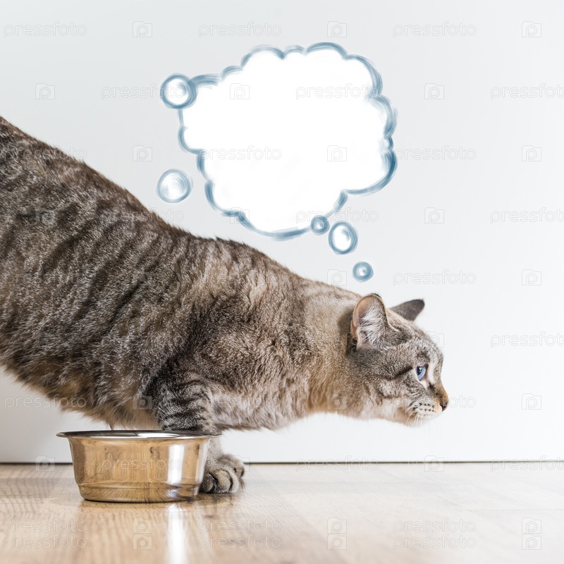 Смешной полосатый кот думает о чем-то, охраняя пустую миску