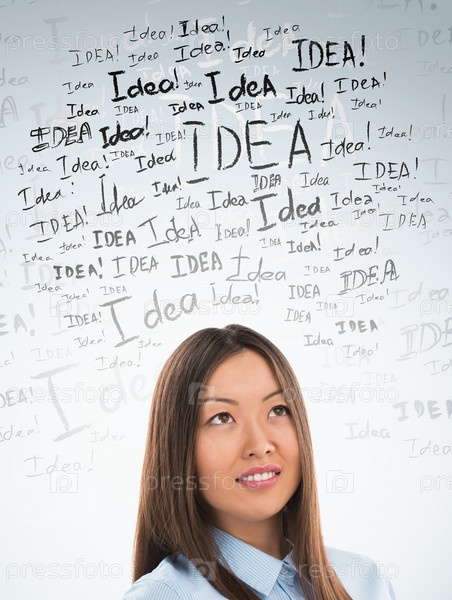 Концепция идеи. Молодая бизнес-леди с знаками идей над головой
