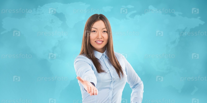 Портрет симпатичной бизнес-леди, протягивающе руку для рукопожатия, на фоне карты мира