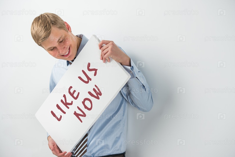 Красивый бизнесмен показывает знак «поставь нам лайк сейчас» на доске