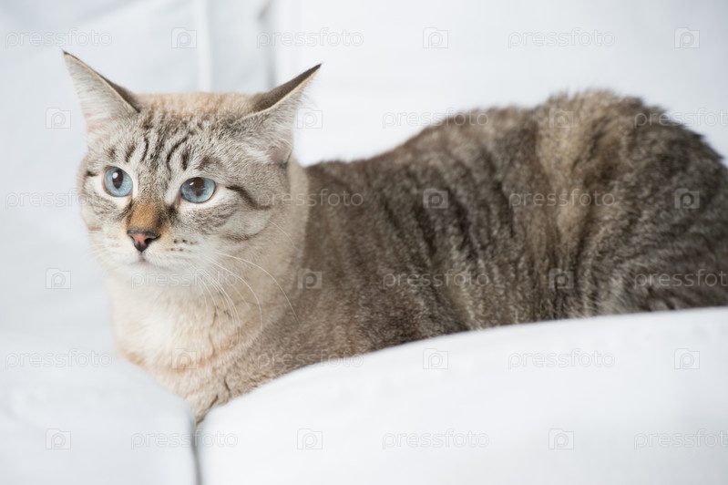 Симпатичный пятнистый кот лежит на диване дома