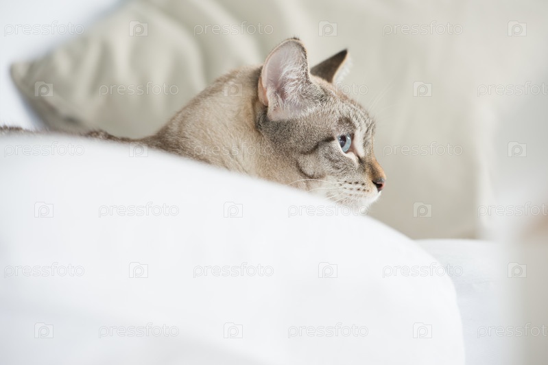 Симпатичный пятнистый кот лежит на диване дома