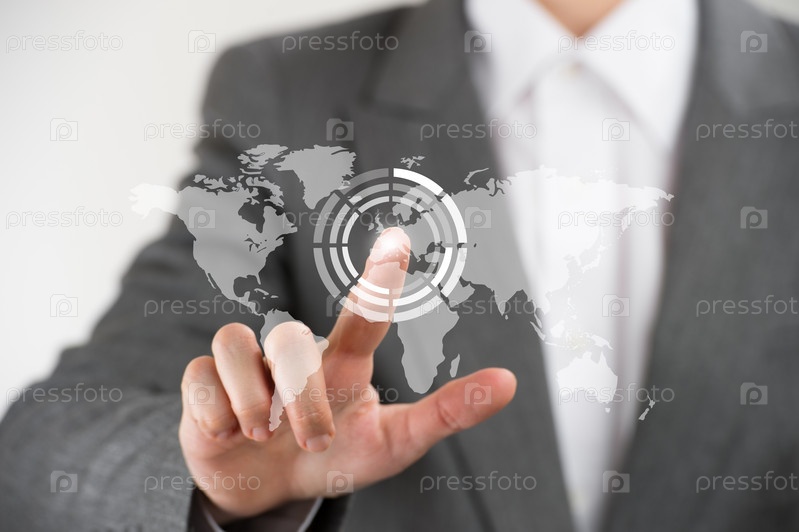 Бизнес-леди указывает пальцем на виртуальные кнопки на карте мира