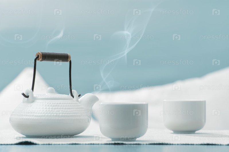 Заварочный чайник и чашки на столе