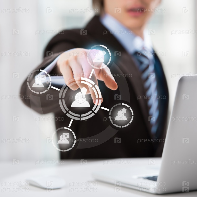Концепция технологии. Бизнесмен и виртуальный интерфейс с веб-иконками