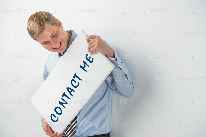 Красивый бизнесмен показывает надпись «свяжитесь со мной» на доске