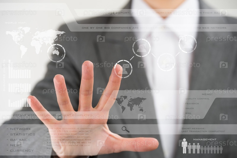 Деловая женщина касается иконок социальной сети на виртуальном экране