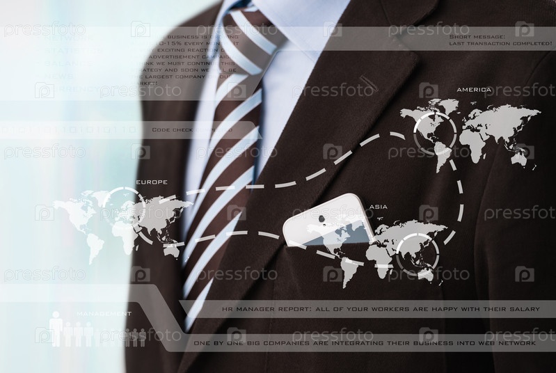 Туловище делового человека в элегантном костюме и мобильный телефон в кармане