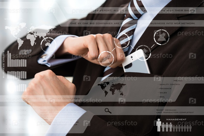 Туловище делового человека в элегантном костюме и мобильный телефон в кармане