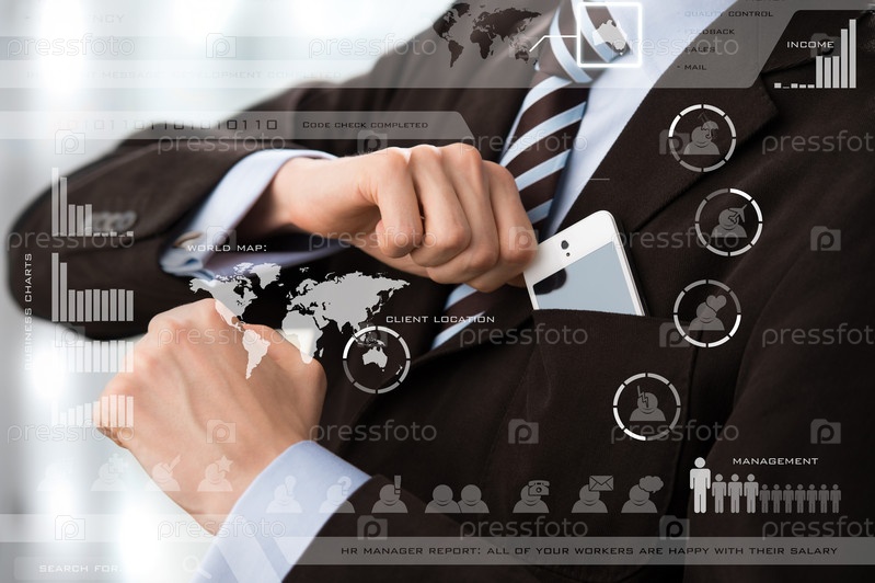 Туловище делового человека в элегантном костюме и мобильный телефон в кармане