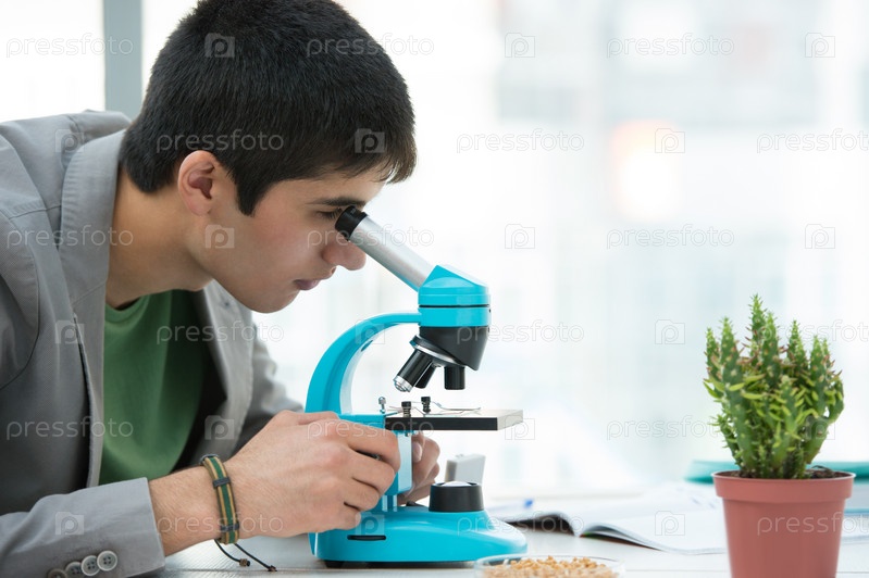Учащийся средней школы. Молодой красивый студент смотрит через микроскоп