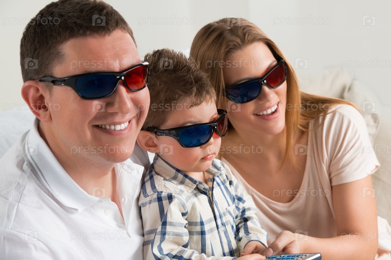 Семья смеется во время просмотра фильма в 3D-очках в гостиной