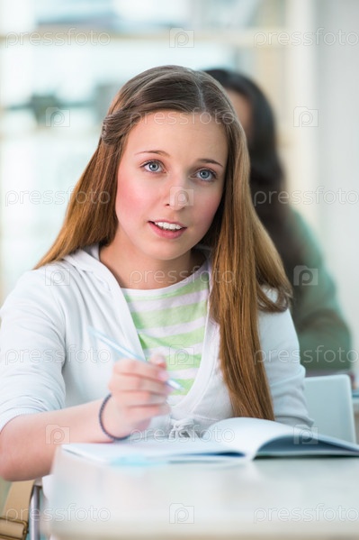 Симпатичная старшеклассница делает заметки в классе на уроке
