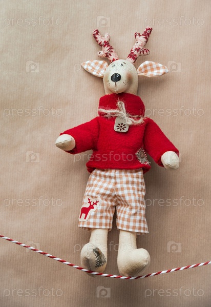Самодельный винтажный рождественский олень висит на ленте на фоне старой натуральной цветной бумаги