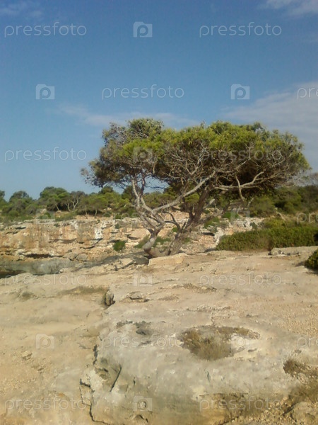 Живописная средиземноморская сосна на скалах ущелья Кала Пи, Мальорка, Испания