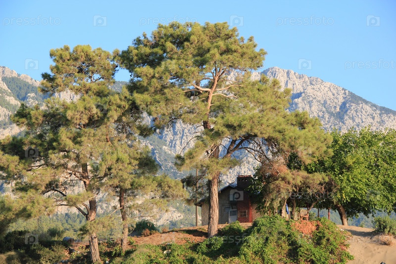 Горы, виднеющиеся за пышными деревьями