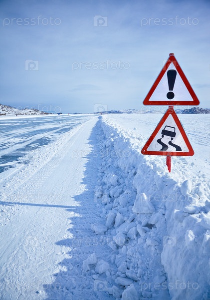 Дорожный знак на льду Байкала