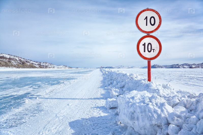 Дорожный знак на льду Байкала