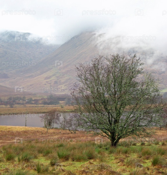 Дерево на фоне озера и горы, Шотландия