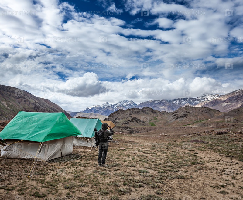 Человек фотографирует Гималаи на мобильный телефон. Долина Спити, Химачал-Прадеш, Индия