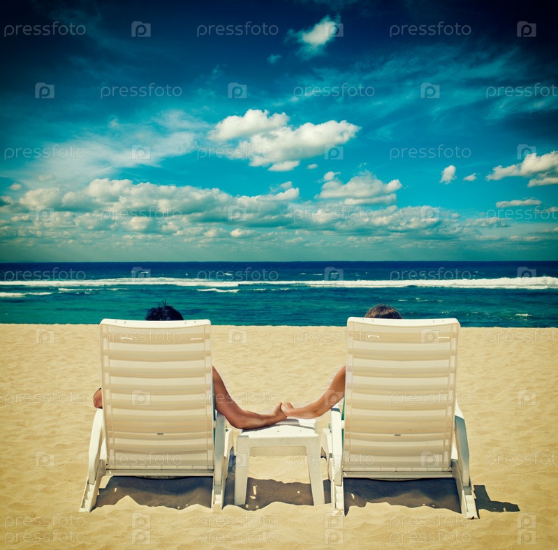 Пара сидит на шезлонгах у океана, взявшись за руки