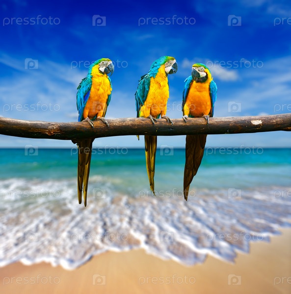 Концепция тропического отдыха.Три попугая голубо-желтых ара, ара арауна, также известные как сине-золотые ара, на тропическом пляже у моря