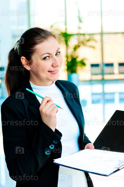 Кокетливо улыбающаяся бизнес-леди с папкой в руках