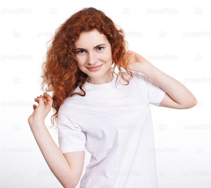 Женщина с рыжими волосами на белом фоне