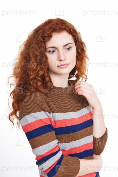 Женщина с рыжими волосами на белом фоне