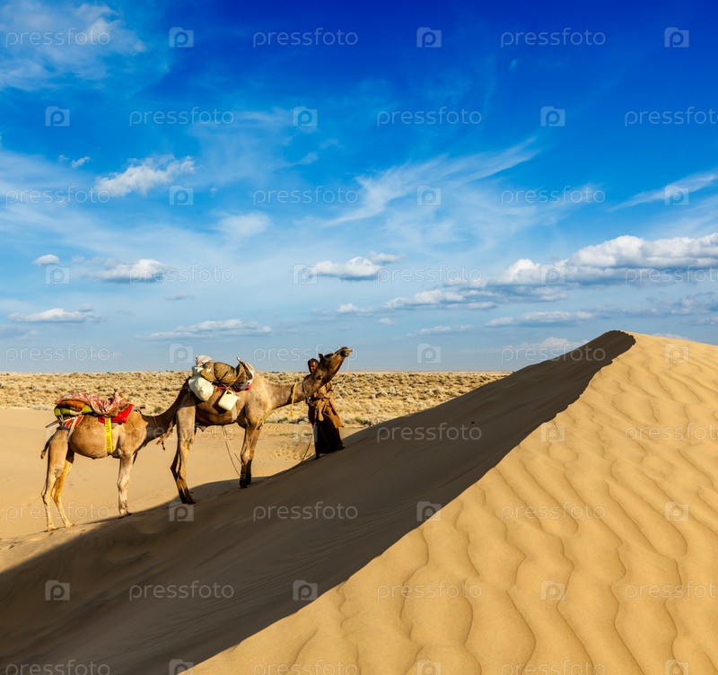 Индийский мужчина погонщик с верблюдом в дюнах пустыни Тар. Джаисалмер, Раджастан, Индия