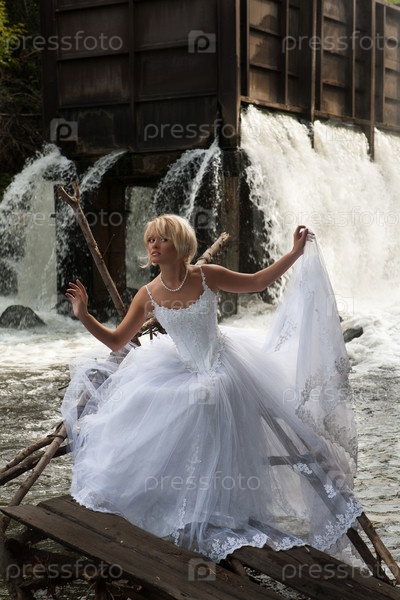 Красивая девушка в белом платье возле водопада