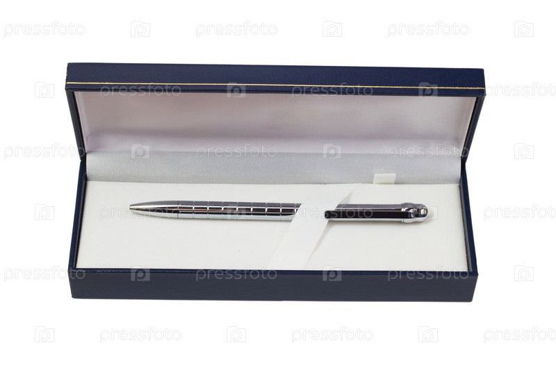 Серебряная ручка в подарочной коробке, изолированная на белом фоне