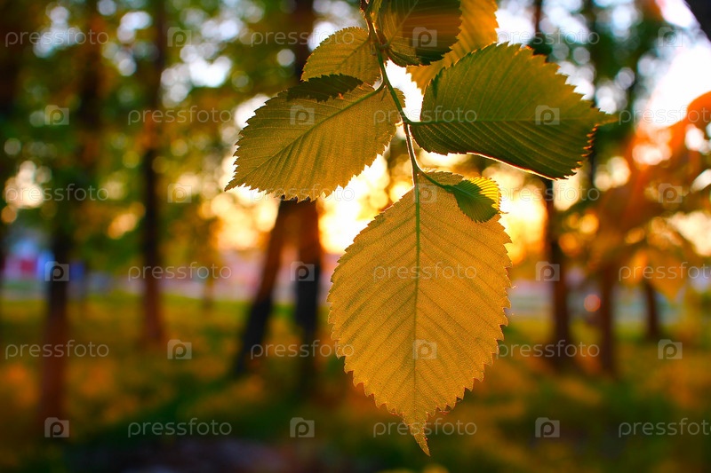 Зеленый лист на закате в солнечном свете
