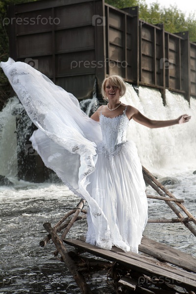Красивая девушка в белом платье возле водопада