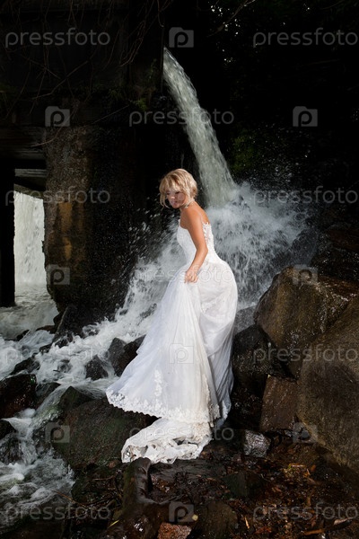 Блондинка в белом платье возле водопада