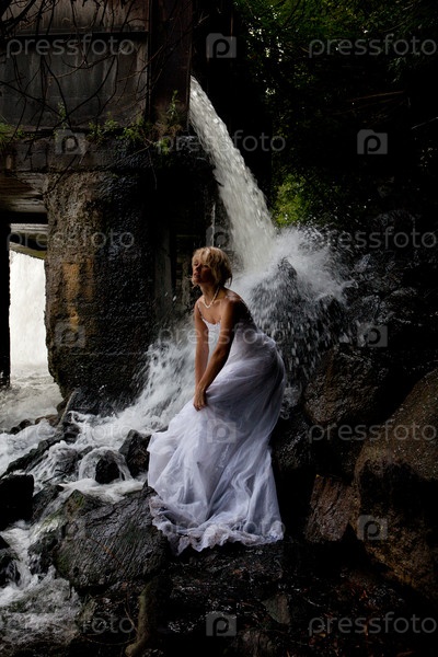 Блондинка в белом платье возле водопада